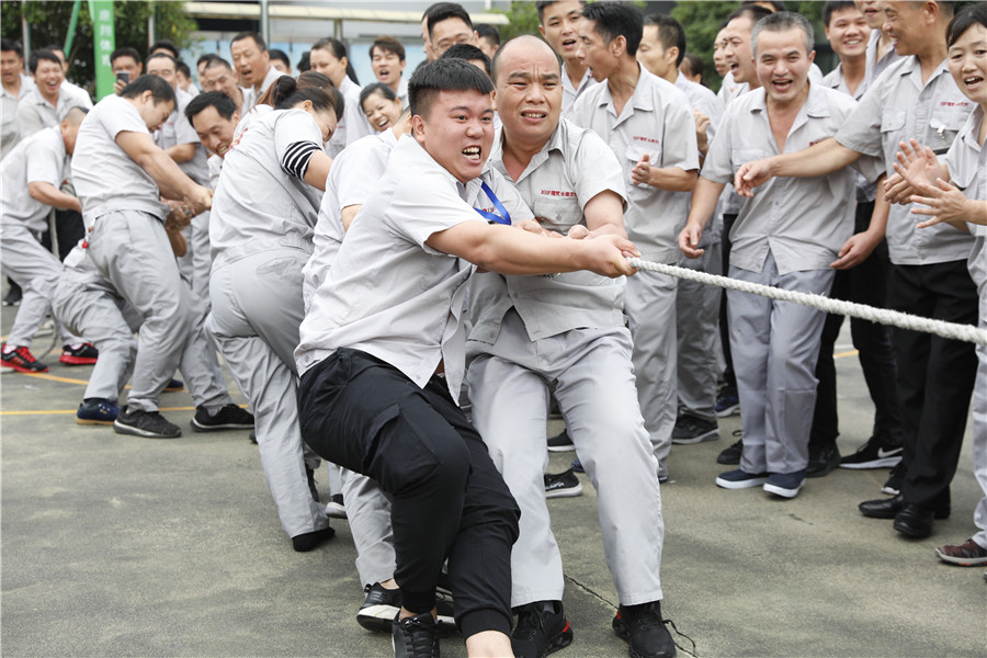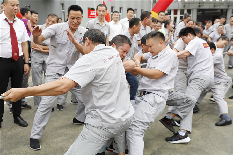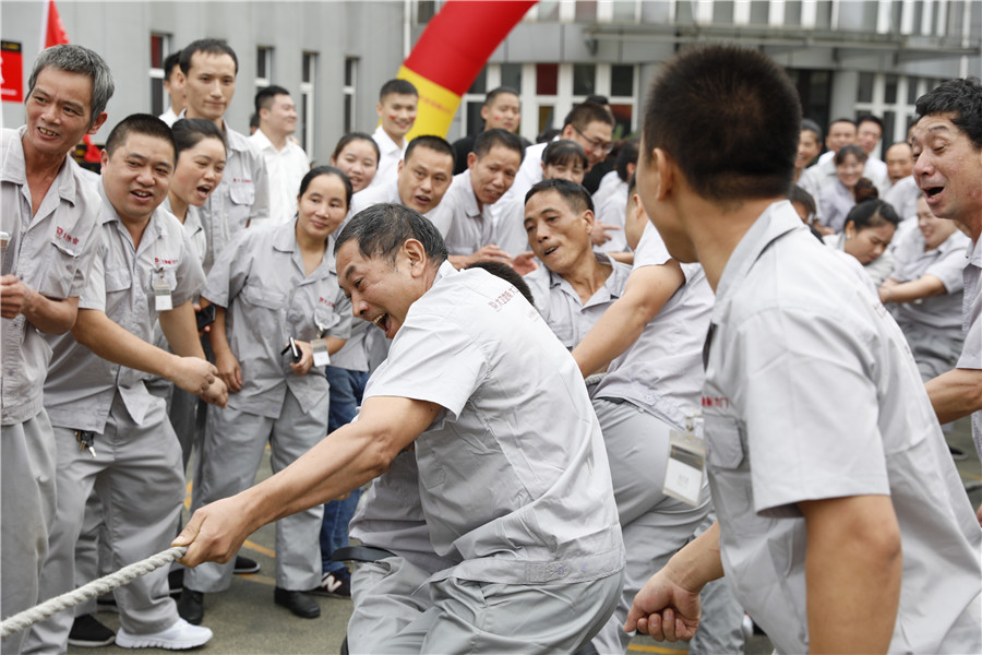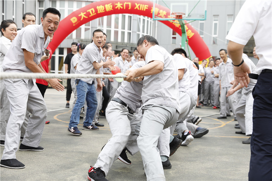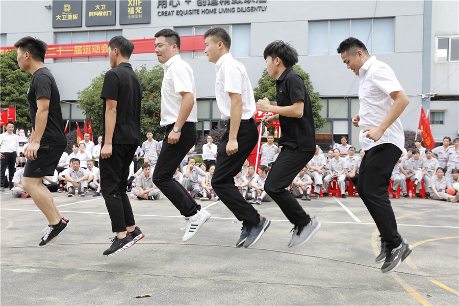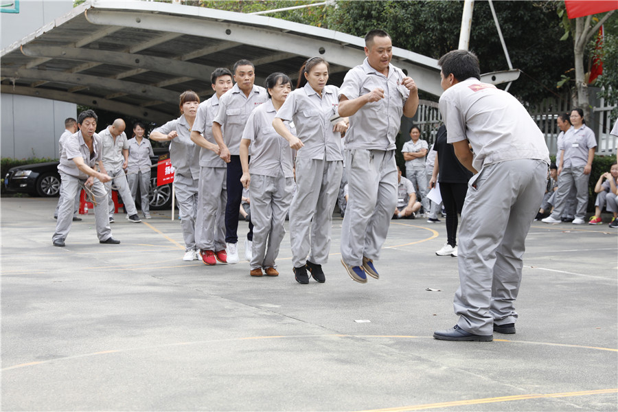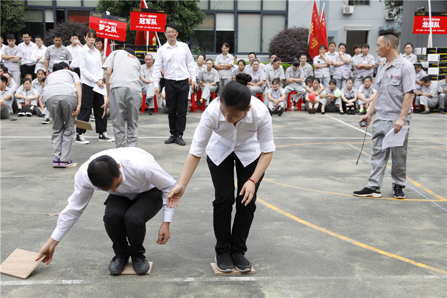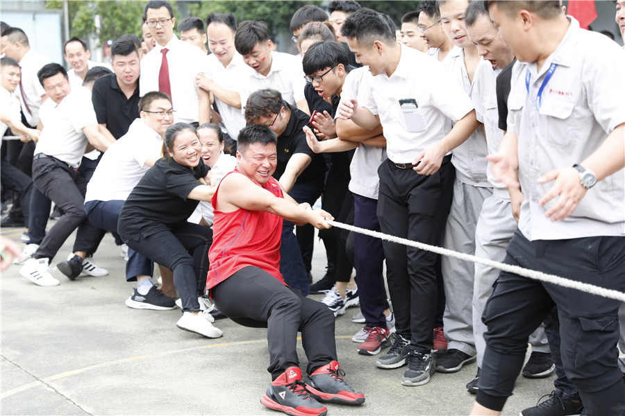 步履铿锵,气势如虹迈着时代的步伐,踩着音乐的节拍在国旗护卫队的护卫下鲜艳的五星红旗缓缓进入操场,参加此次运动会的共有龙凤队,扬帆队,冲锋队,冠军队,梦之队,群英队,金盾队,狂浪队八支队伍,本次趣味运动会共分8个项目,名称分别为:士气展示、拔河、集体跳长绳、过河接力赛、带球赛跑、赶篮球接力跑、抛绣球、花样接力。新颖滑稽的比赛项目,使整场比赛充满了娱乐性,员工的参与热情十分高涨,整个活动精彩纷呈,每个人脸上都洋溢着笑容,极大的缓解了职工的压力,放松了心情。