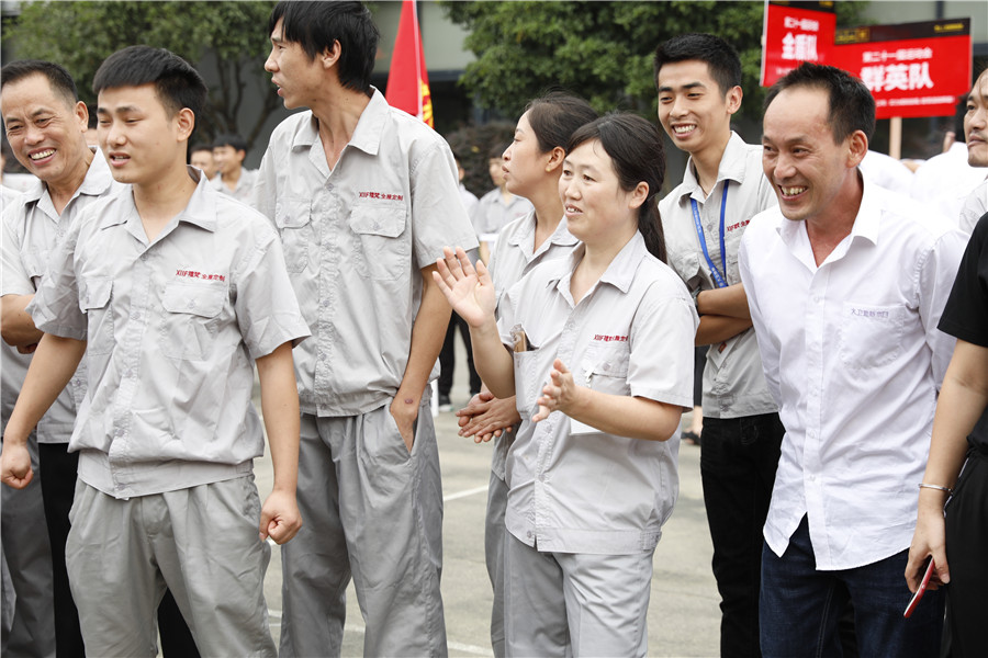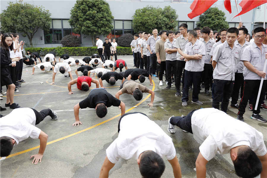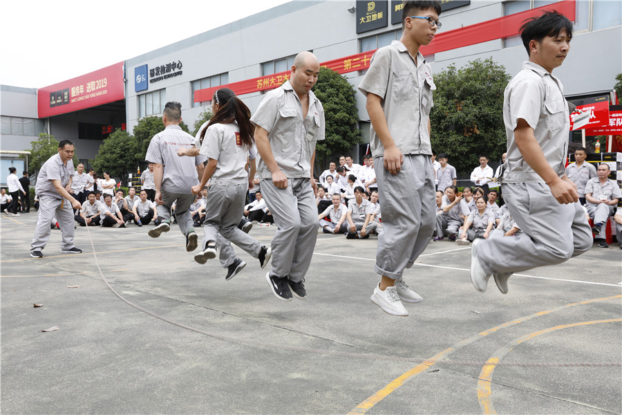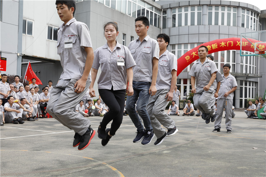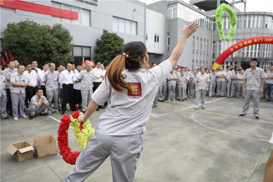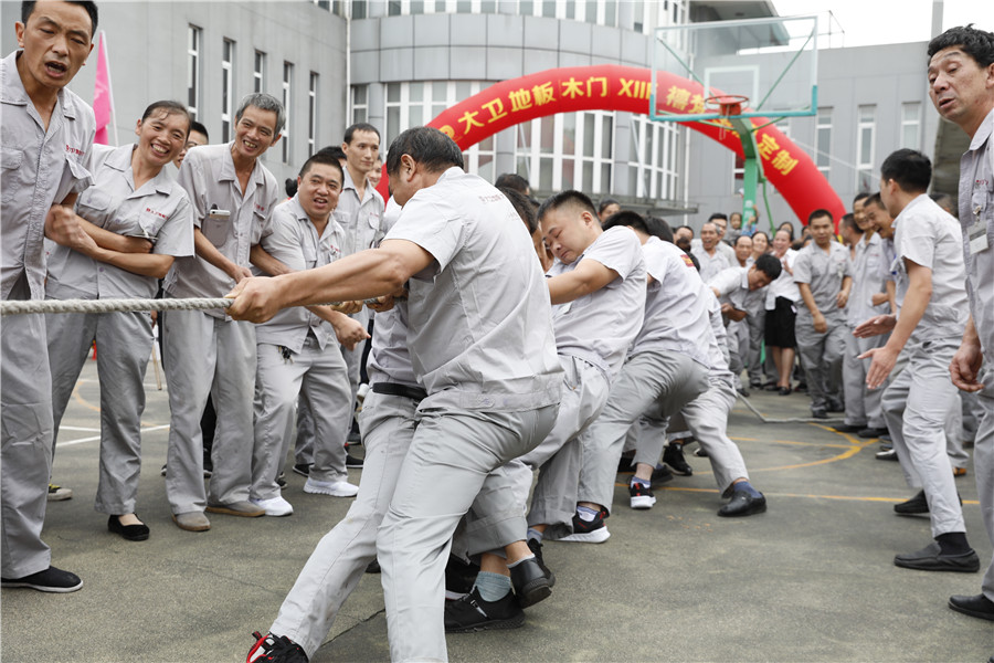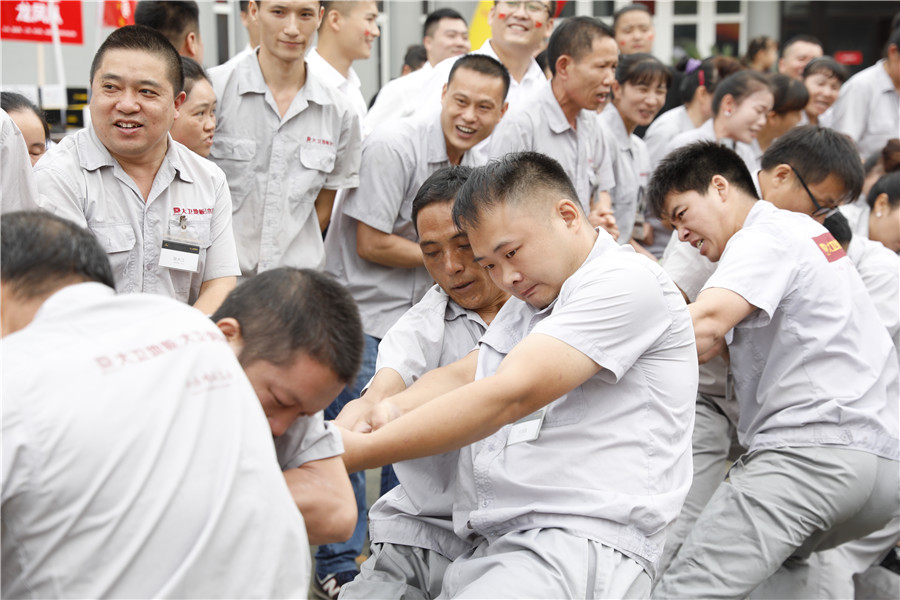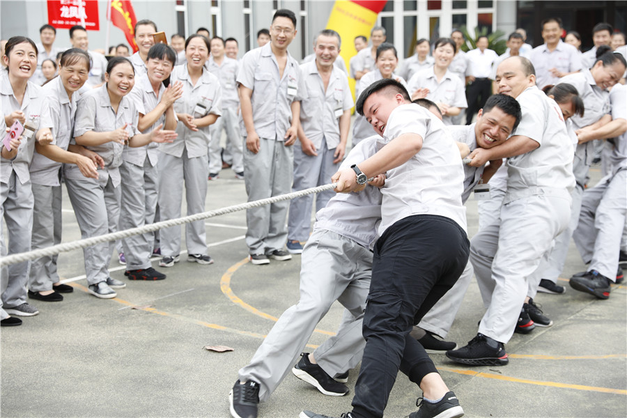 步履铿锵,气势如虹迈着时代的步伐,踩着音乐的节拍在国旗护卫队的护卫下鲜艳的五星红旗缓缓进入操场,参加此次运动会的共有龙凤队,扬帆队,冲锋队,冠军队,梦之队,群英队,金盾队,狂浪队八支队伍,本次趣味运动会共分8个项目,名称分别为:士气展示、拔河、集体跳长绳、过河接力赛、带球赛跑、赶篮球接力跑、抛绣球、花样接力。新颖滑稽的比赛项目,使整场比赛充满了娱乐性,员工的参与热情十分高涨,整个活动精彩纷呈,每个人脸上都洋溢着笑容,极大的缓解了职工的压力,放松了心情。